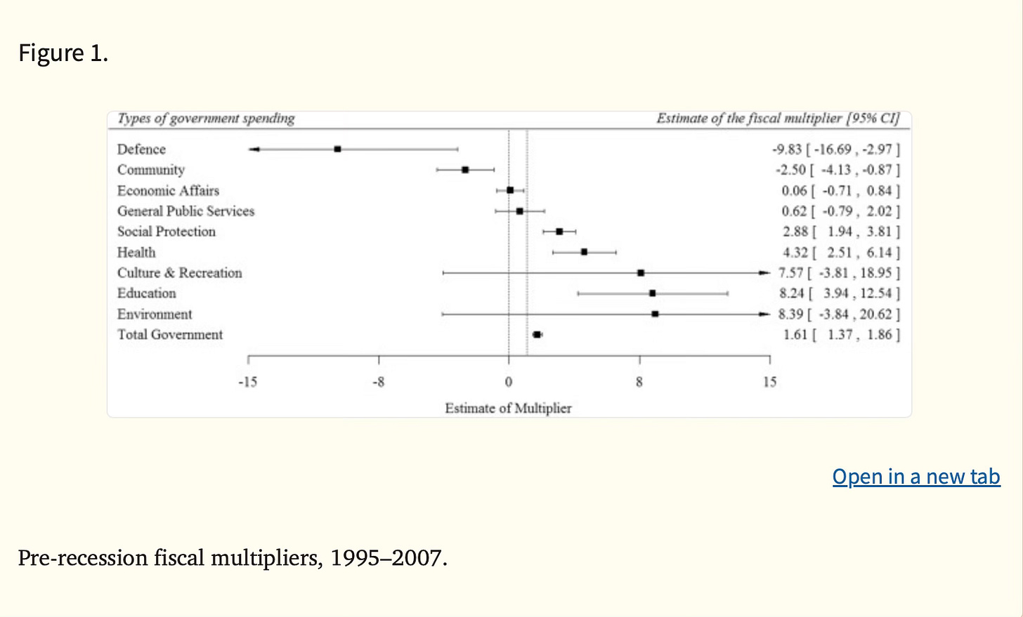 The largest positive fiscal multipliers are generated when money is spent on health (4) and education (>8). It’s not rocket science - spending money to keep your people healthy and educated provides a large net boost to the economy.