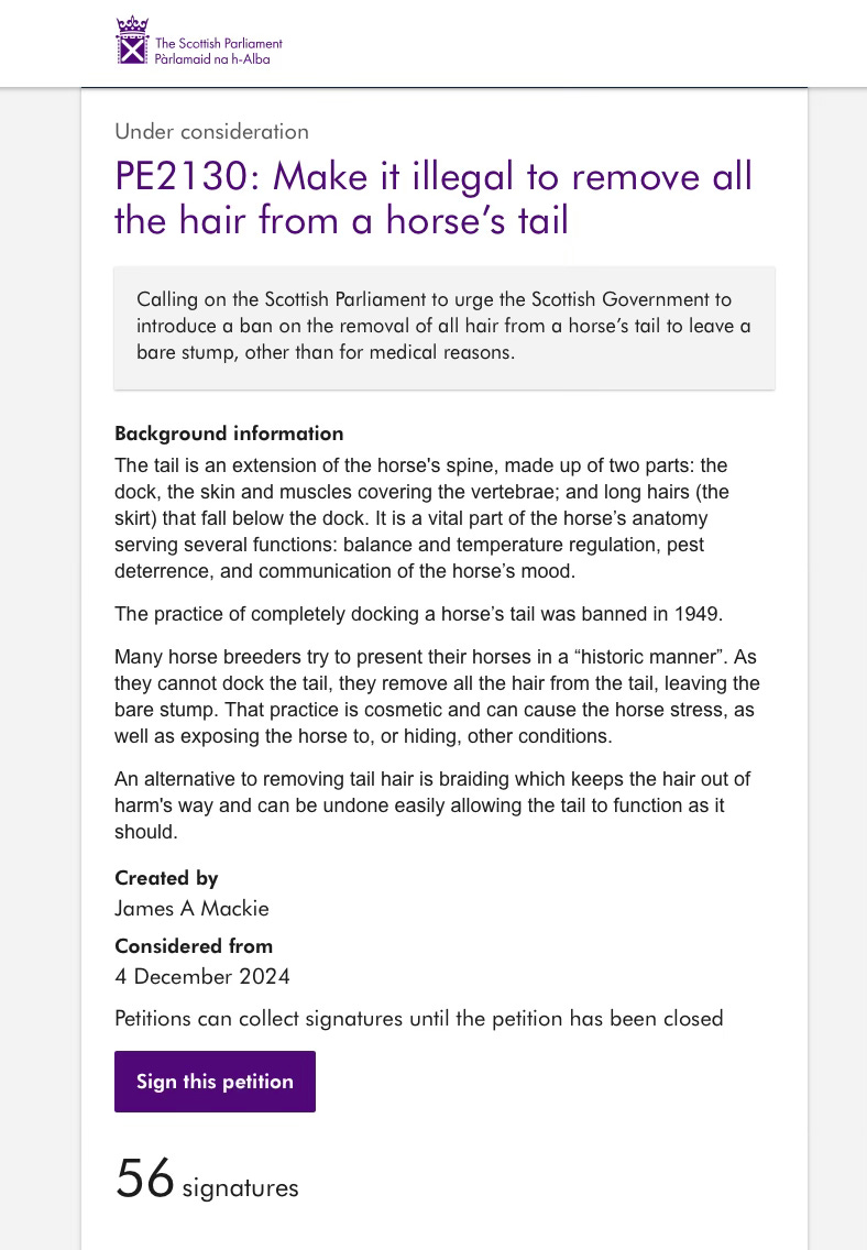 But the number of signatures clearly doesn’t matter. The committee voted to keep open PE2130, making it illegal to remove all the hair from a horse’s tail (56 signatures), and PE2132, asking for a published timeline for the dualling of the A96 between Inverness and Nairn (508 signatures).