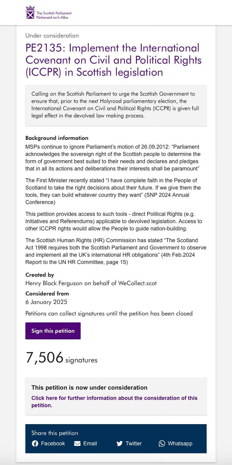 At its meeting today, the Citizens Participation and Public Petitions Committee (CPPPC) shut down a legal route to Scottish Self-Determination. That route, clearly laid out by Respect Scottish Sovereignty (RSS), is through enacting the United Nations International Covenant on Civil and Political Rights (ICCPR) into Scots law, PE2135. The Committee voted unanimously to close the petition down.