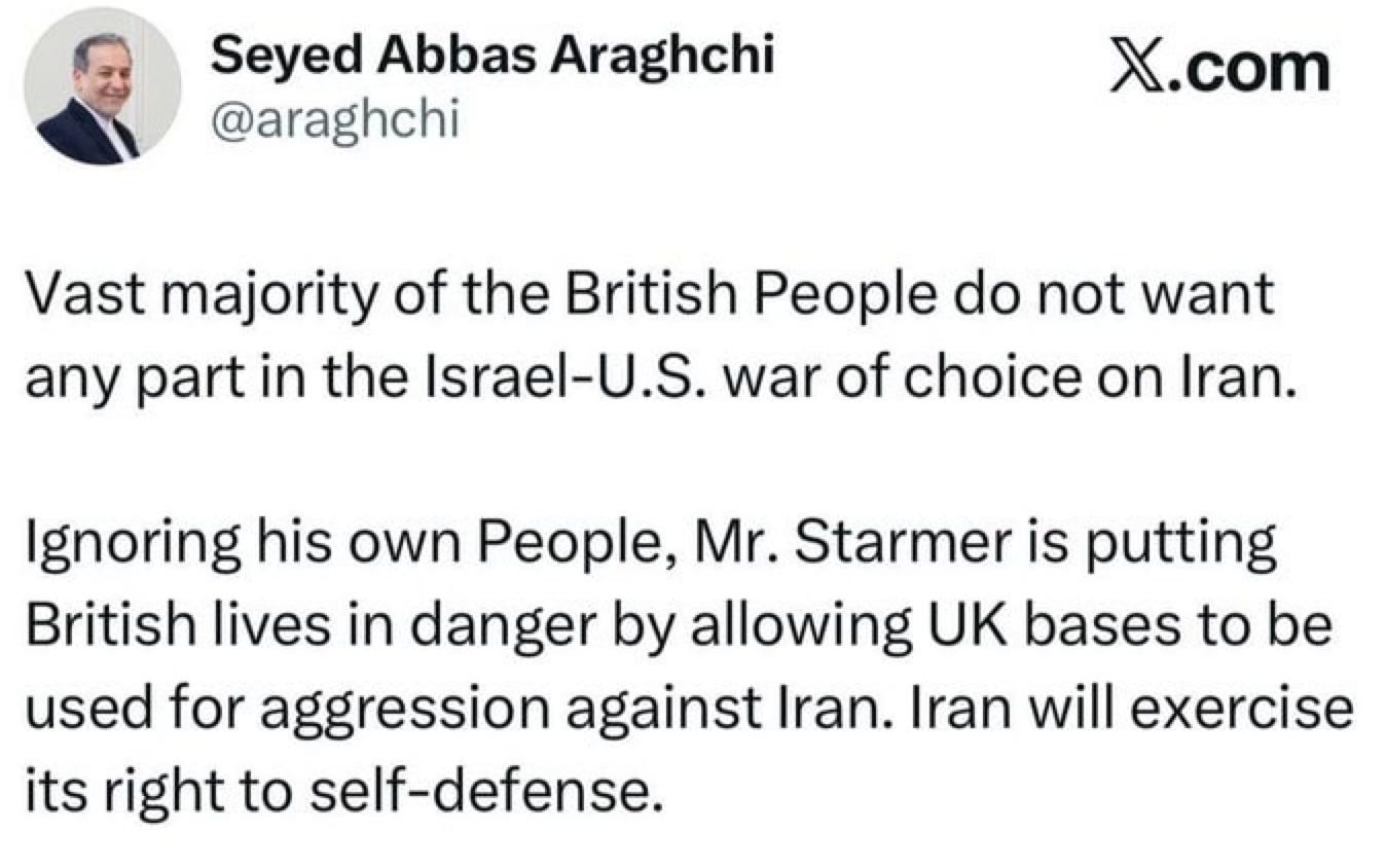 Amidst his enthusiastic support for the US/zionist entity’s illegal war of aggression, Starmer’s declaration that the UK won’t be drawn into a wider regional war is patently absurd. He only refused to send ships to the region because the UK doesn’t have any that are operational, and if it did, they’d be sitting ducks. US aircraft carriers have moved over 1,000 km away from Iran to avoid Iranian rockets and drones and are having their own “operational issues” after being repeatedly sabotaged by their crew.