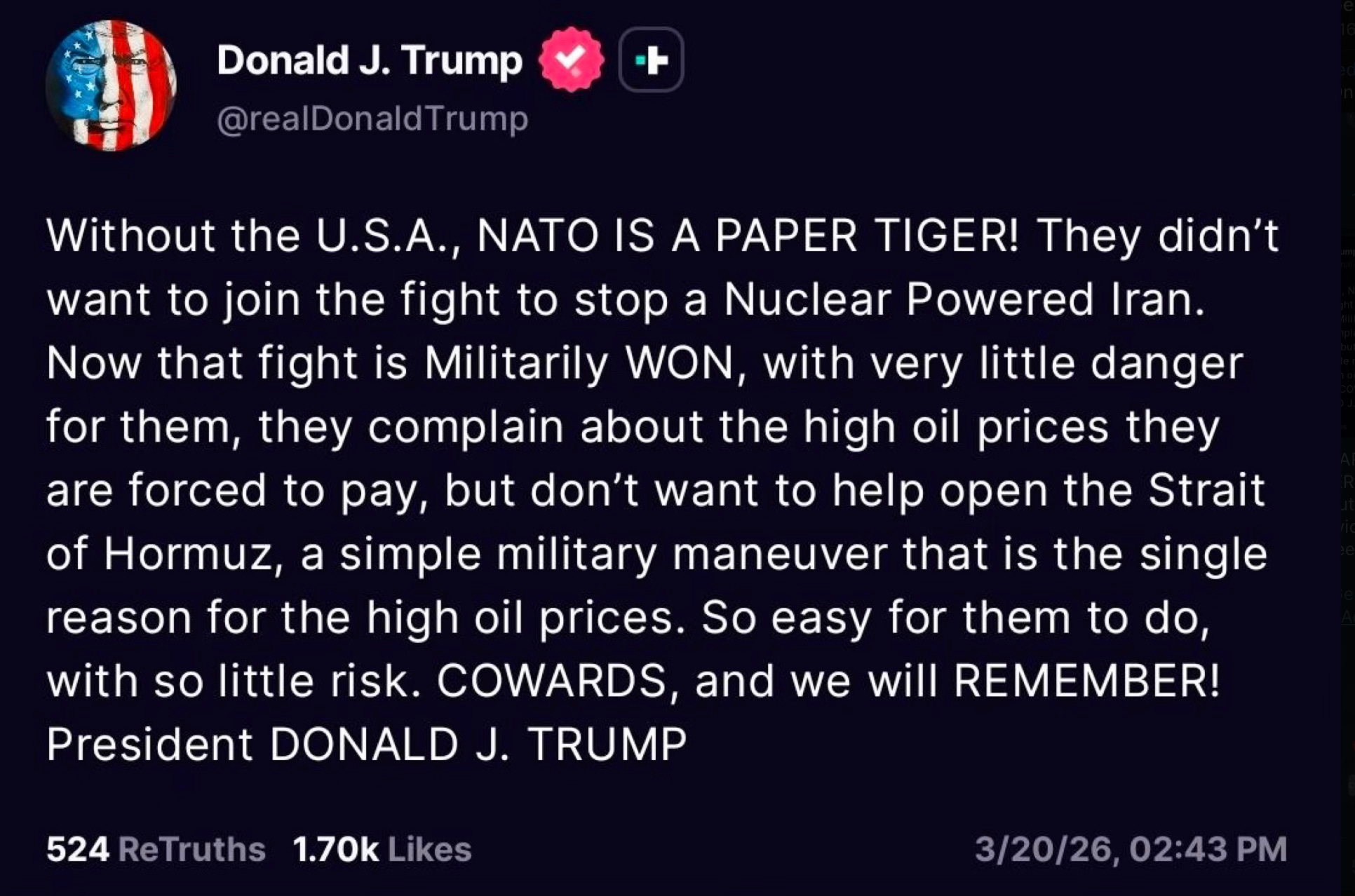 It’s not working. Zion Don had another meltdown, calling the Europeans cowards and saying that NATO is a paper tiger without the mighty US.